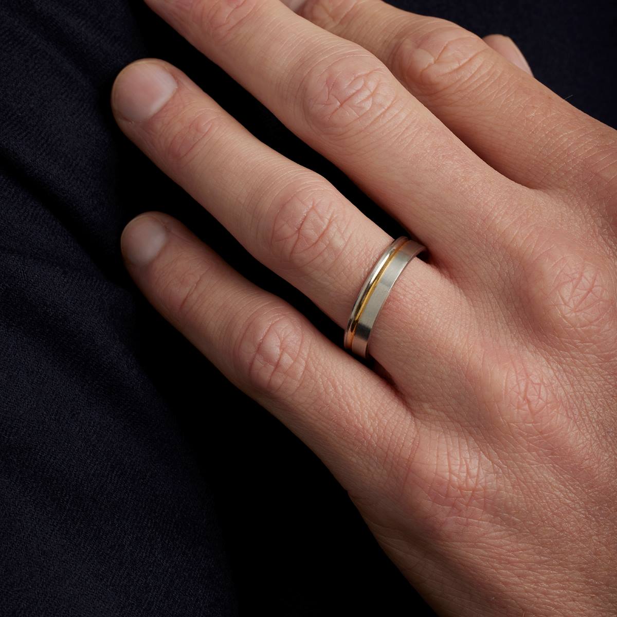 Une alliance de mariage à l'aspect contemporain pour homme ou femme. Bicolore, elle est composée d'une base en platine et d'un filet asymétrique traversant en or jaune 18 carats. De type ruban à la finition brossée et aux bords biseautés, cette alliance existe en 2 versions de largeur : 4 mm et 5 mm.