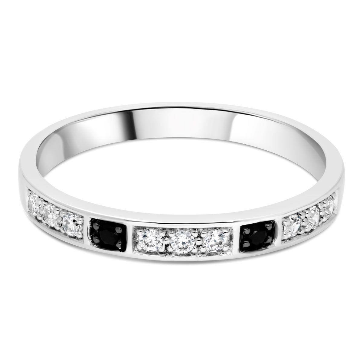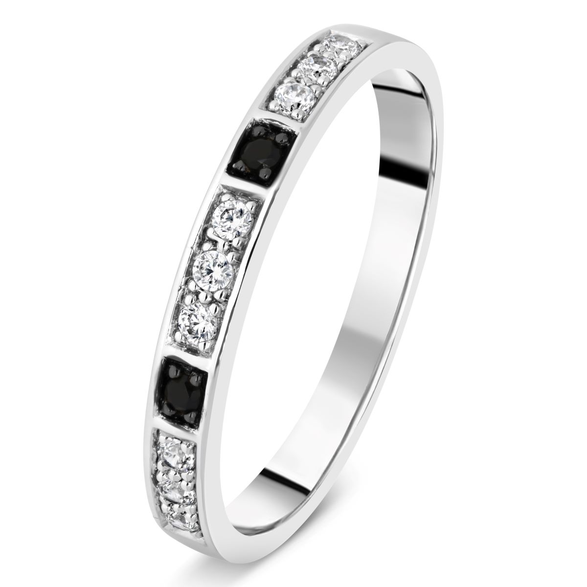 Alliance en or blanc, sertie de 11 diamants en demi-tour. Pour un contraste subtil et raffiné, deux diamants noirs viennent ponctuer l’anneau, créant une touche contemporaine et singulière. L’harmonie entre la brillance des diamants blancs et la profondeur du noir confère à cette alliance une allure moderne.