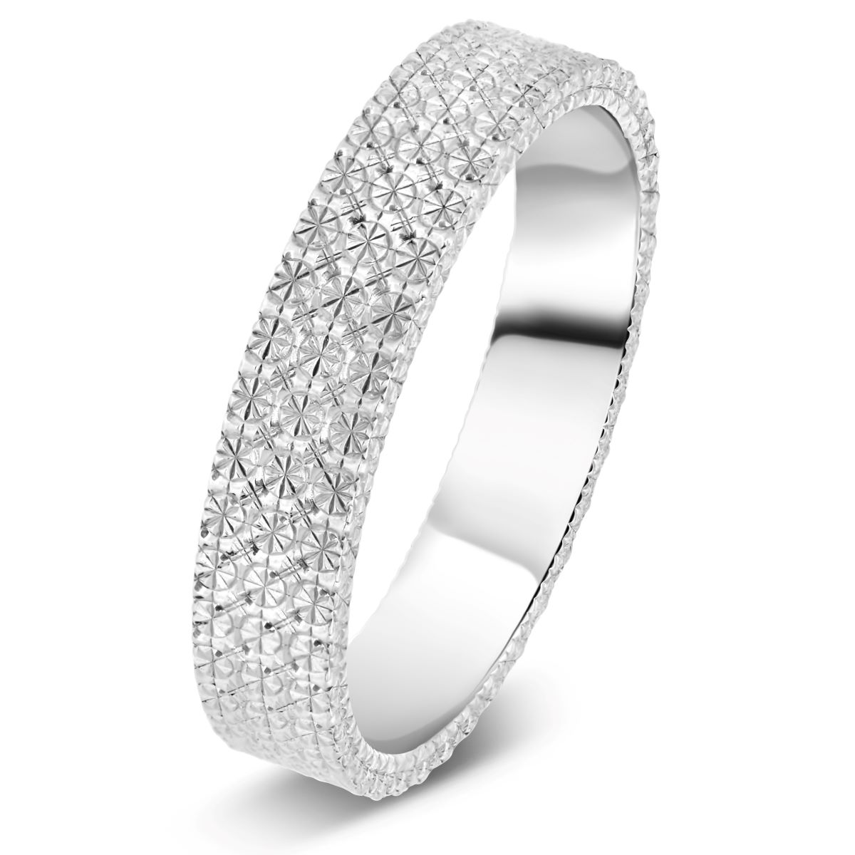 Une alliance de mariage contemporain en or blanc 18 ou 9 carats pour femme, présentant 3 rangées ciselées diamantées.