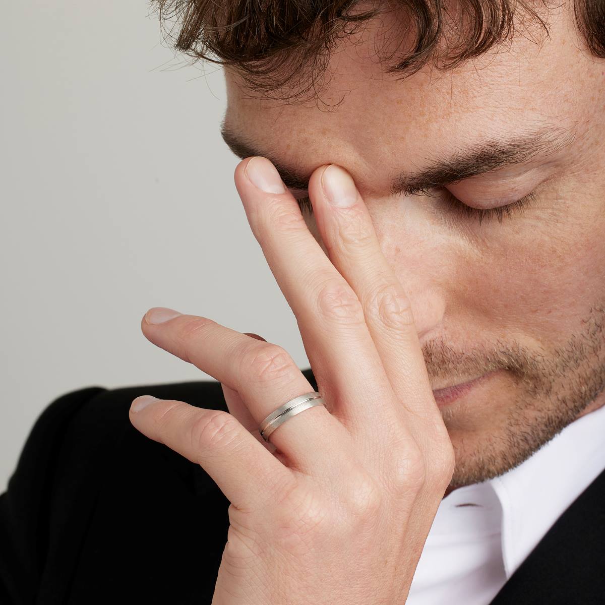 Alliance en platine brossé légèrement bombée pour homme. Très sobre et discrète elle arbore un filet droit au centre. Existe en 3.5 mm et 4.5 mm.