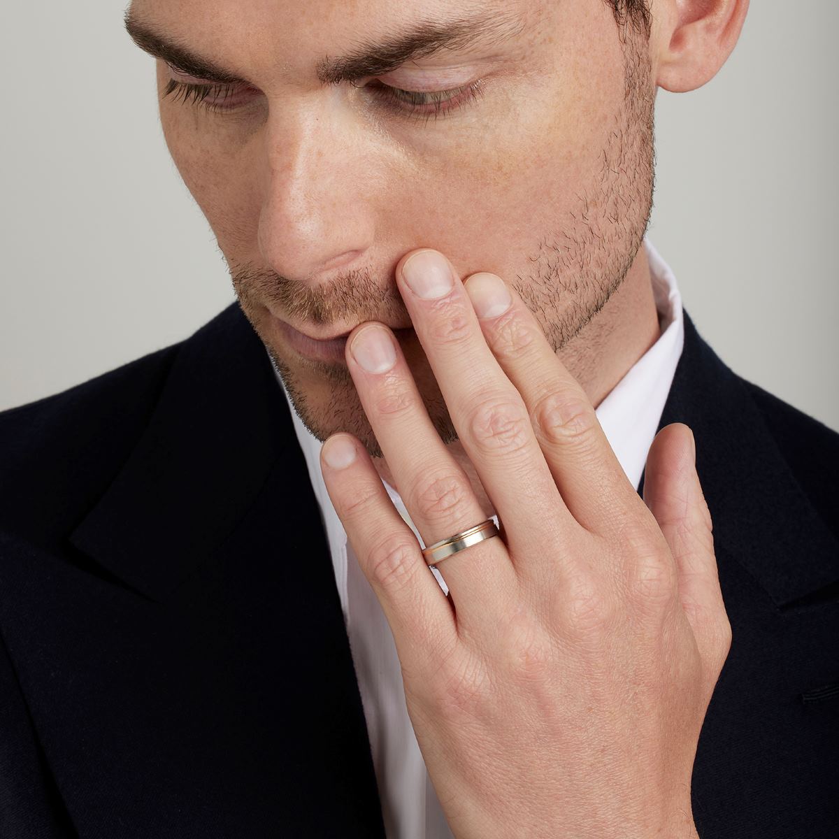 Une alliance de mariage à l'aspect contemporain pour homme ou femme. Bicolore, elle est composée d'une base en platine et d'un filet asymétrique traversant en or rouge 18 carats. De type ruban à la finition brossée et aux bords biseautés, cette alliance existe en 2 largeurs : 4 mm et 5 mm.