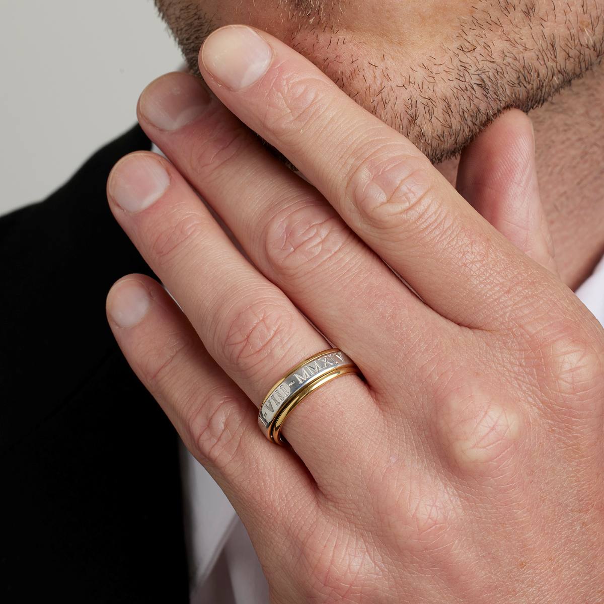 Une alliance de mariage pour homme ou femme dite "romaine". Tournante, elle est composée d'un anneau mobile en platine sur une base en or jaune 18 carats. La date du mariage est gravée en chiffres romains à l’extérieur, une gravure intérieure est également possible. L'alliance existe en largeurs de 6,5 mm et 7 mm pour une épaisseur de 2 mm.