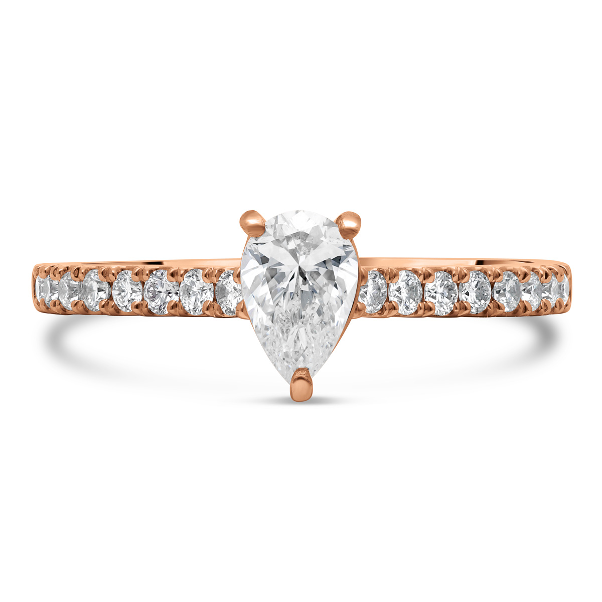 Le design de la bague « Tahiti » magnifie la silhouette allongée du diamant poire qui se trouve en son centre. L'anneau en or rose, pavé de diamants, renforce l’éclat de la pierre centrale.